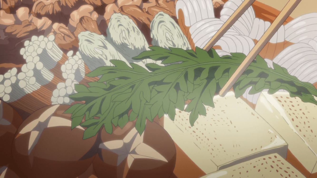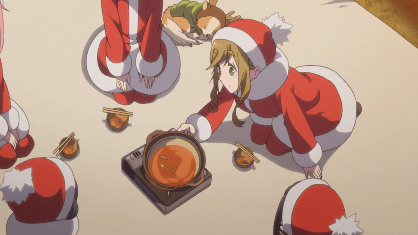 Then we get a voice over as the cook Sukiyaki. They eat it, it’s very delicious and various girls monologue about the sukiyaki. We get a flasback of snaggle tooth talking with her family, about food. Suddenly everyone gets dressed in Santa Suits and they cook more food and then eat it and it seems it’s good. Then they want to cook again but in the climax of the episode, it seems the cooker is out of gas. Fortunately, they are able to overcome this obstacle by sending Rin to the store to get more gas and more food.