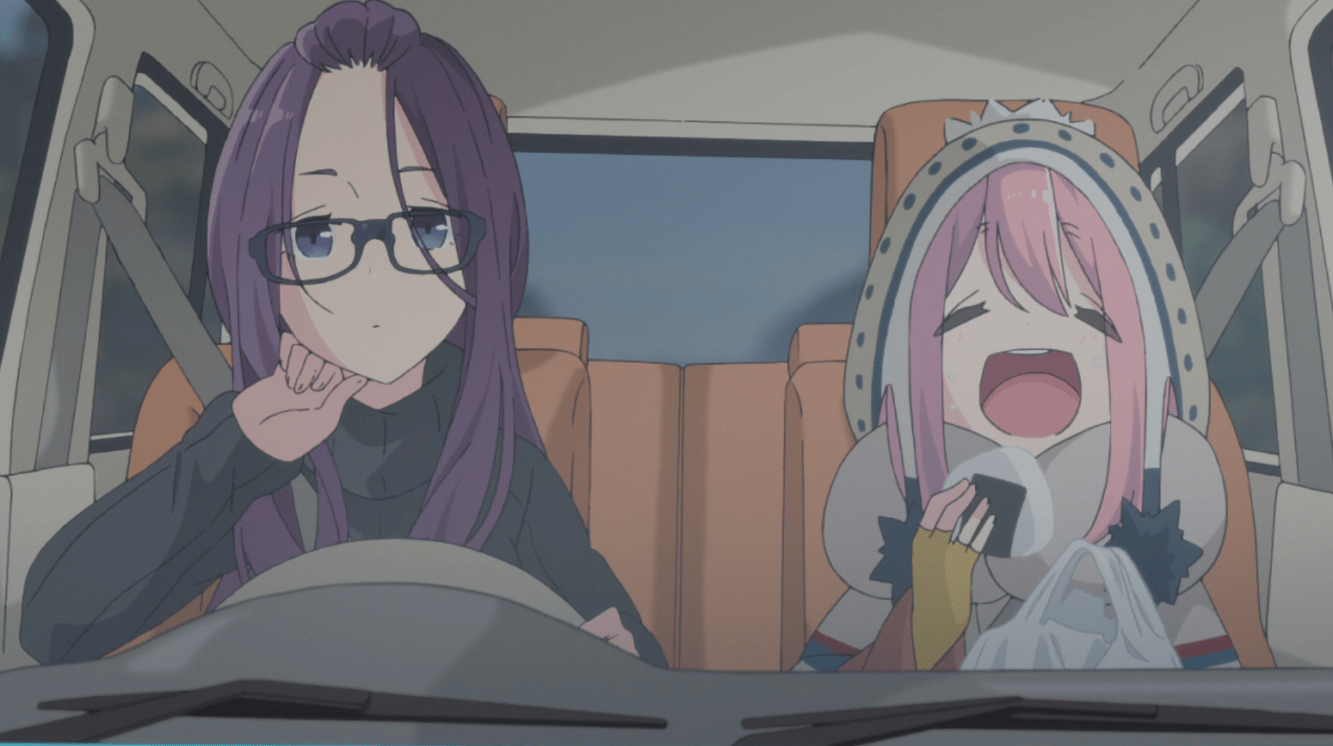 We jump to Nadeshiko in a car with her hot sister. She’s eating. Back to Rin who is setting up her tent and Nadeshiko arrives. Nadeshiko immediately tells Rin she’s hungry and we watch them make smores. Then they eat the smores and Nadeshiko really likes them.