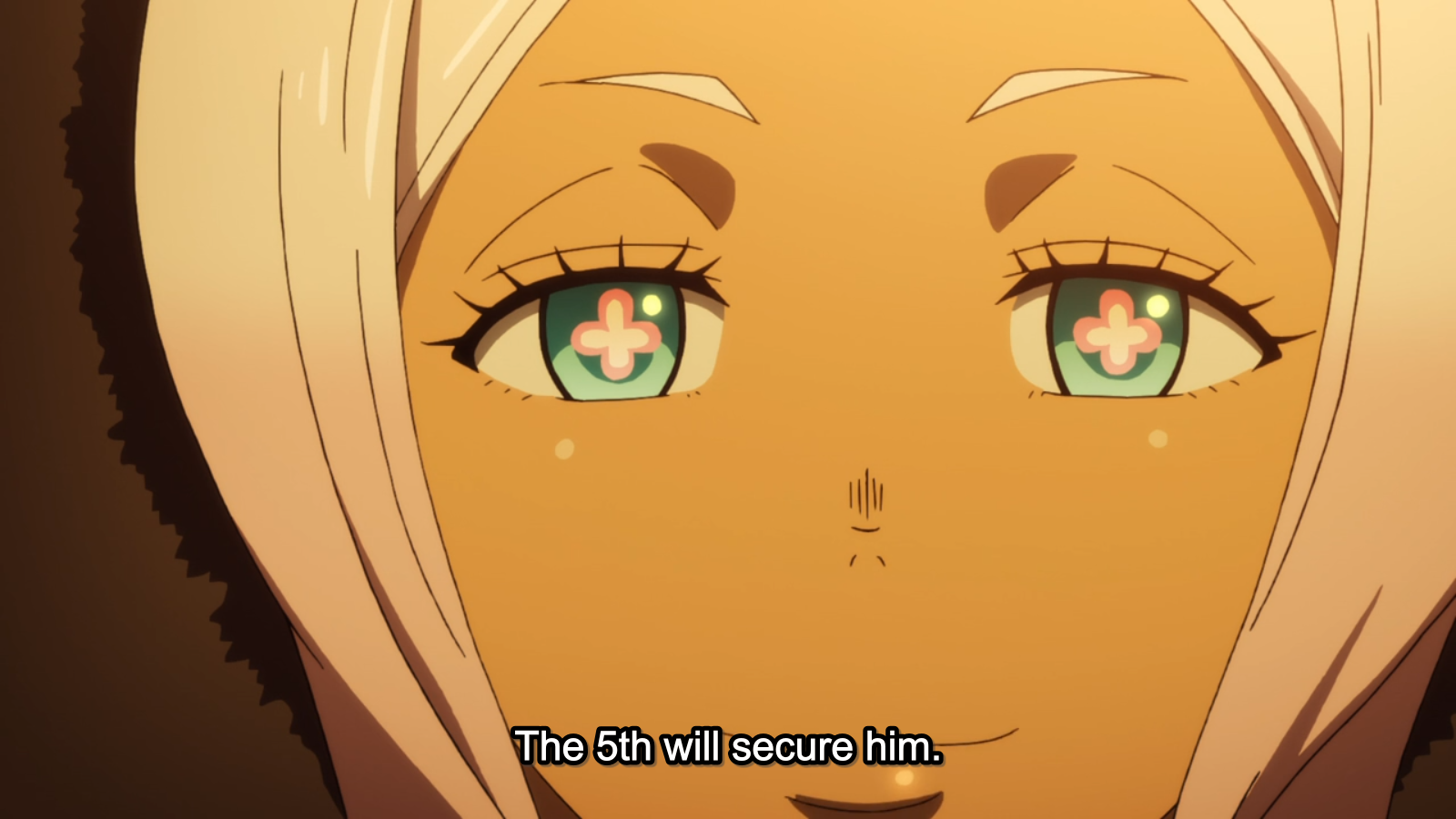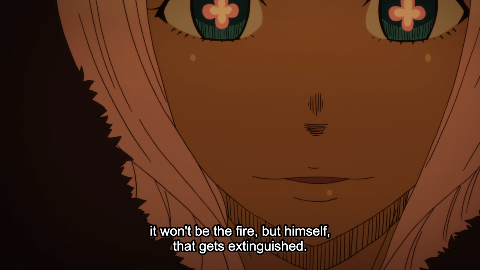 Those screenshots really do group in scenes, don’t they? (One thing I don’t like about the show is how those neon-colours stand out – the uniform stripes, for example, but also the crosses (clovers?) in new grils eyes.) And it’s amazing how different the flames look in motion; this is where screenshots reach their limit.