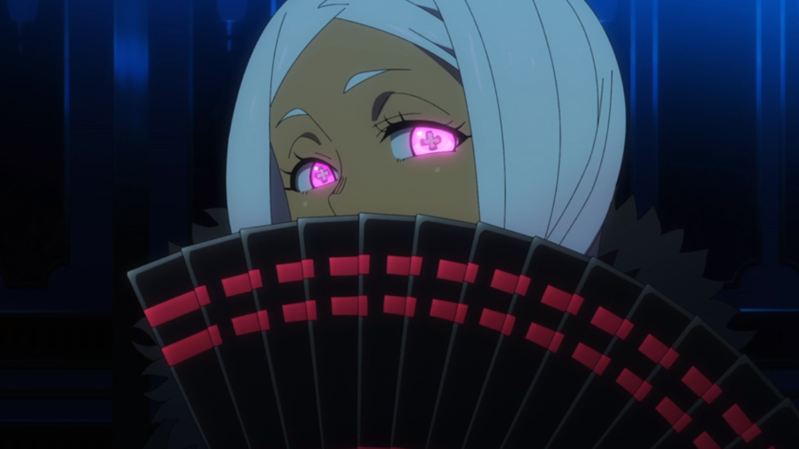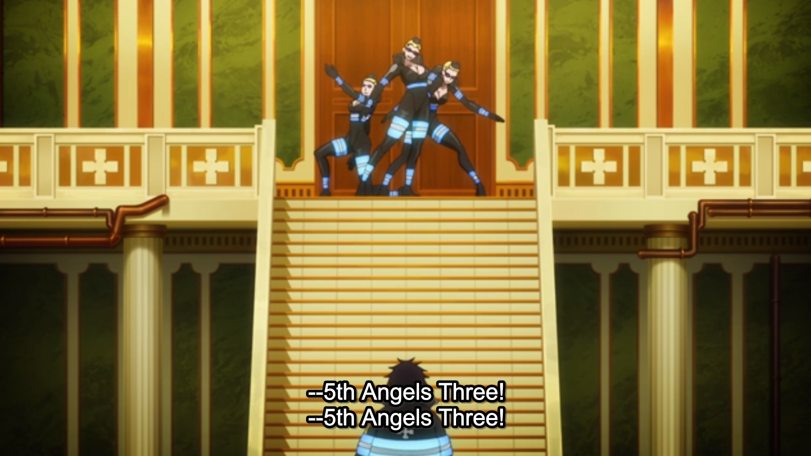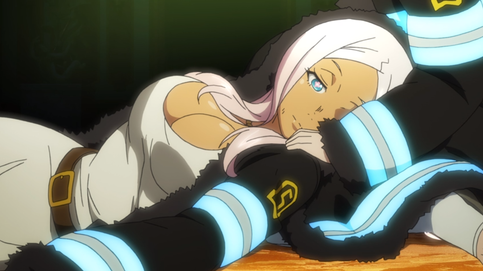 The shiny blue stripes of the Fire Force uniform are often used as a beacon. I think it’s a brilliant and visually dramatic tool. The designers should give themselves a pat on the back.