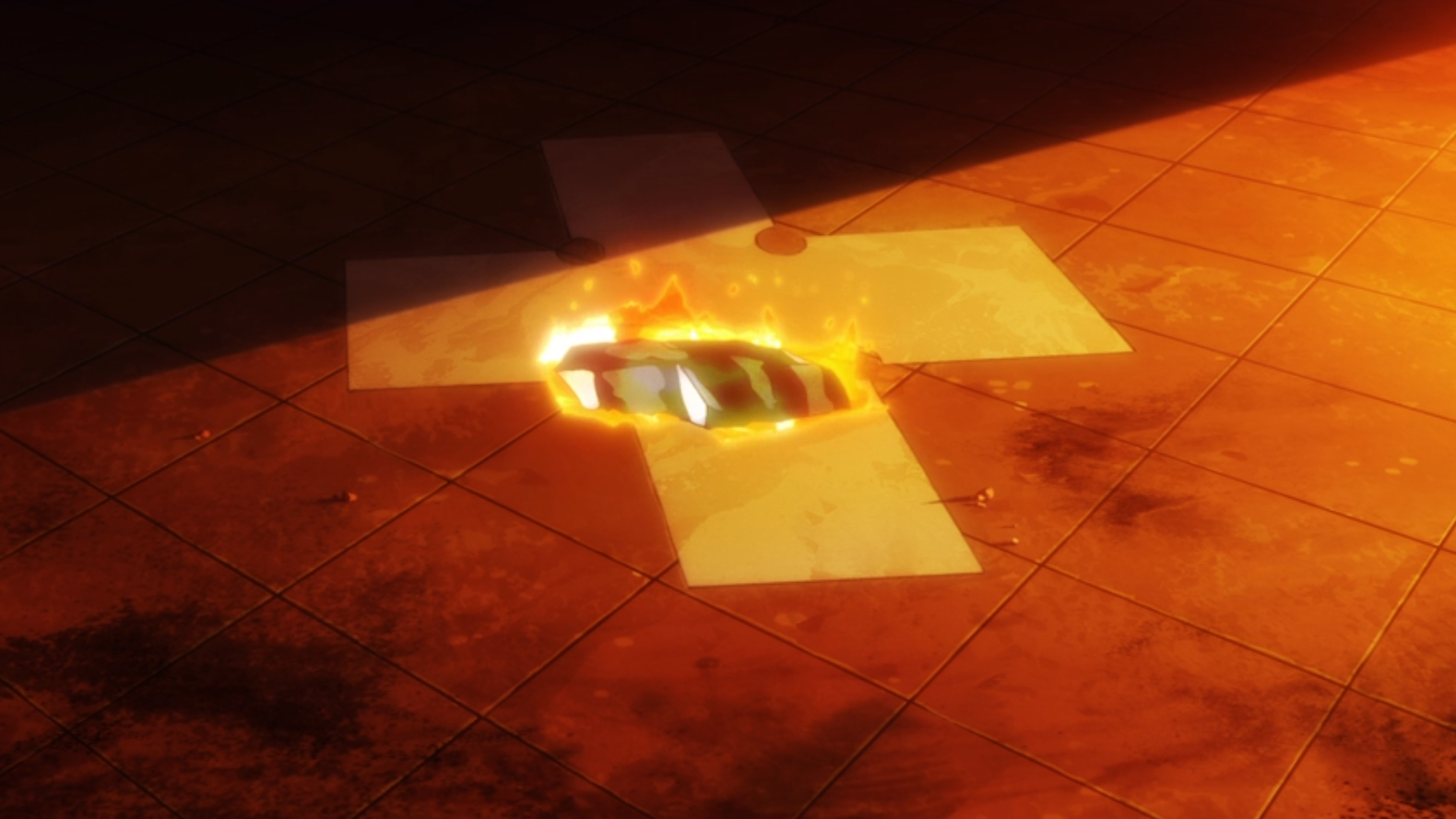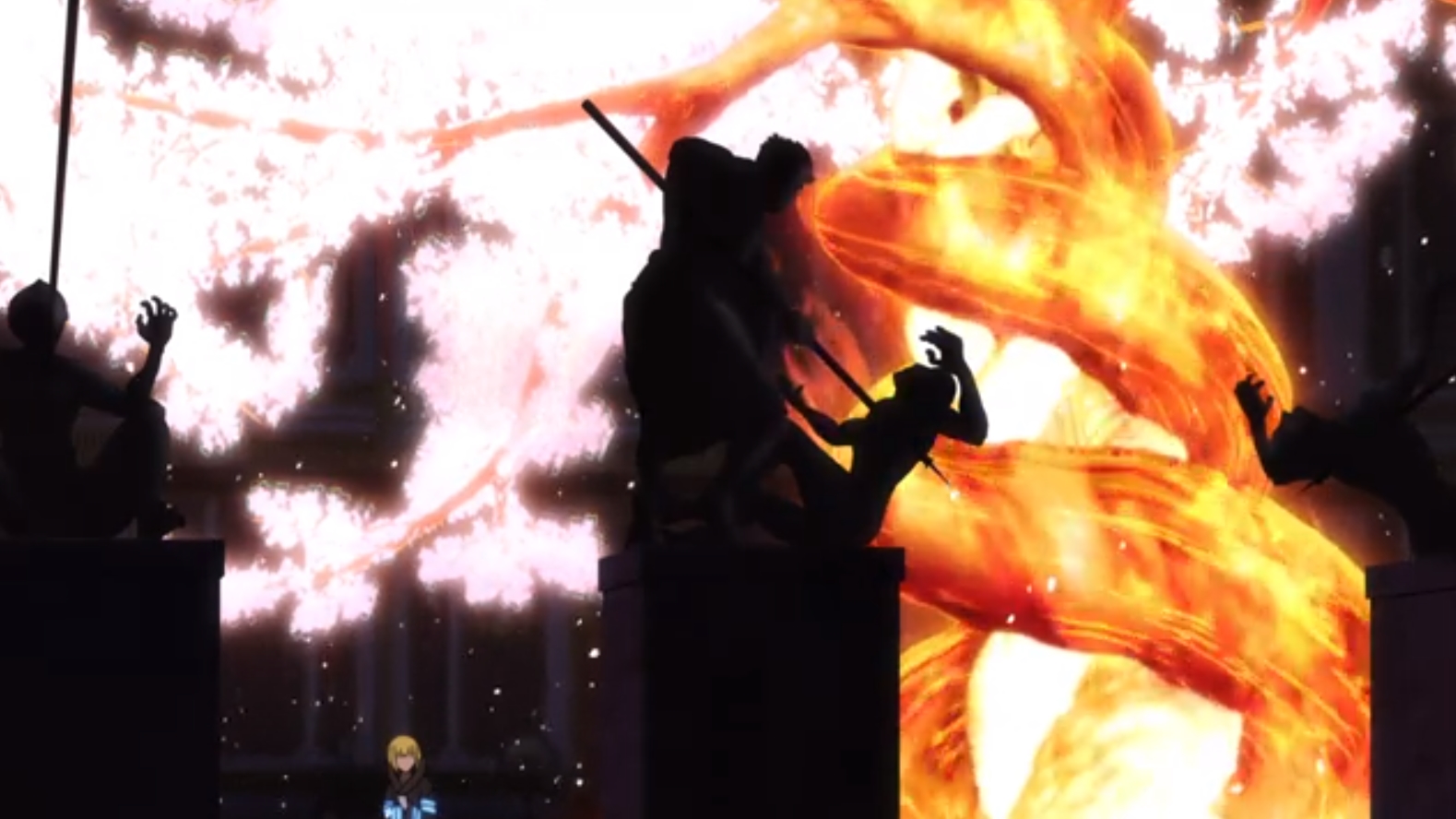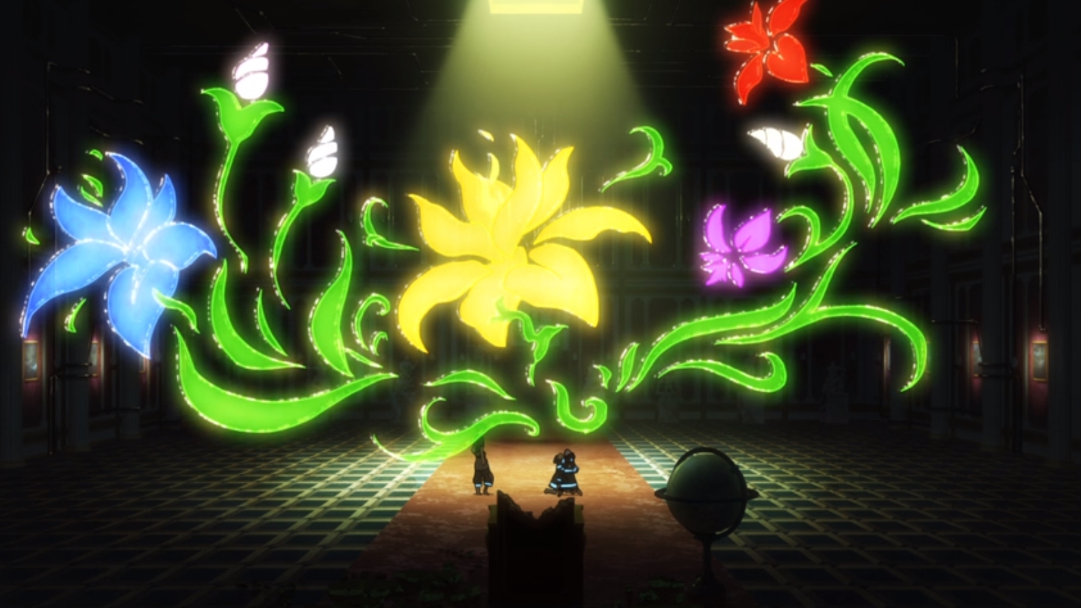 The shiny blue stripes of the Fire Force uniform are often used as a beacon. I think it’s a brilliant and visually dramatic tool. The designers should give themselves a pat on the back.