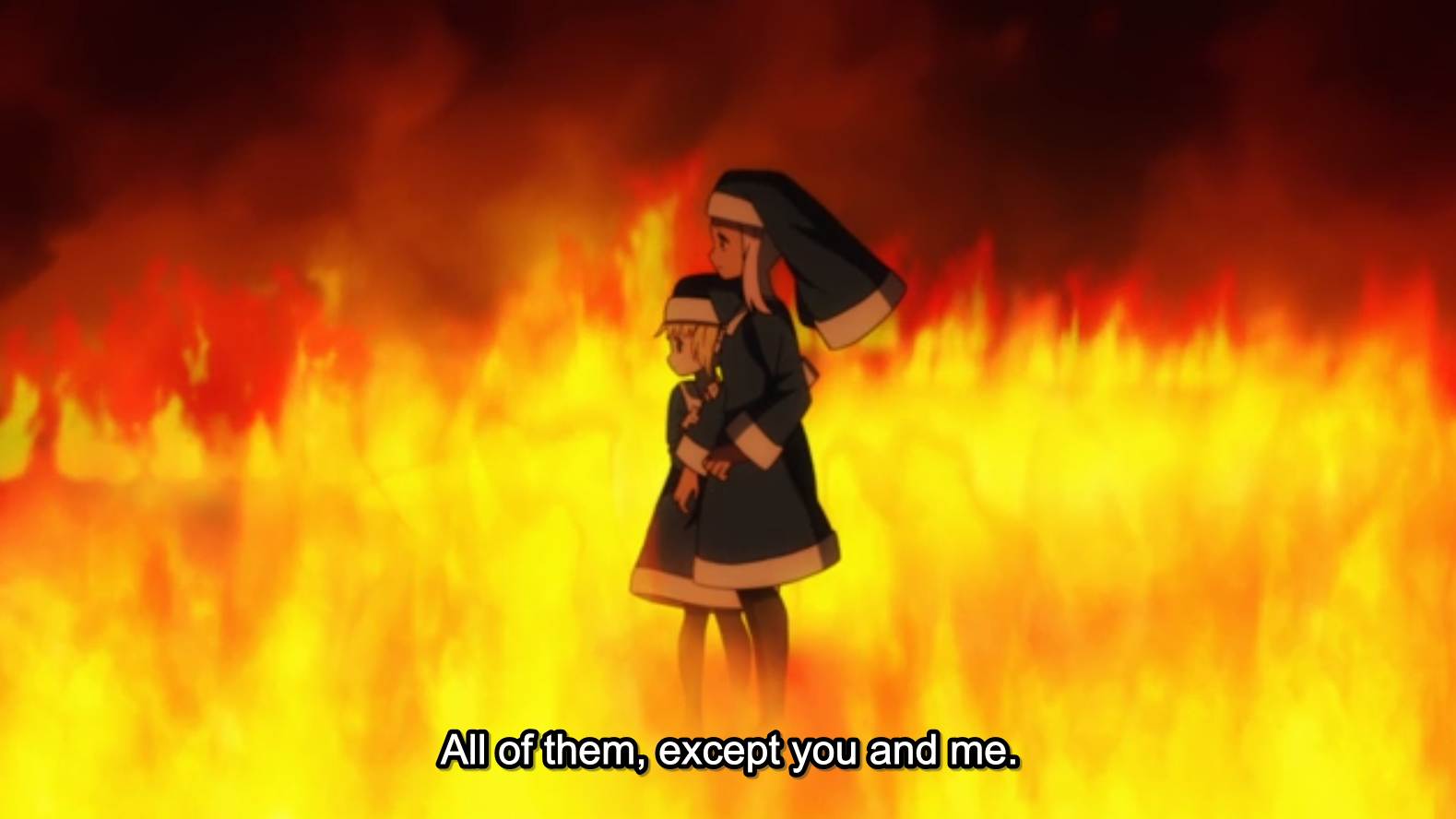 I’ve been looking at Fire Force skies a lot, and maybe it’s because it’s a flashback but it’s a lot greyer and lighter than usual in these scenes. Normally it always looks a deep royal blue.