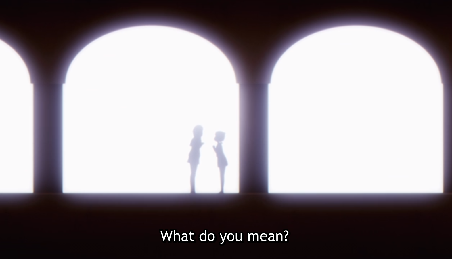Finally, that before last cap of the two silhouetted in the arches. We see several variants of the shot. It’s great framing and reminded my or the marionette interludes in Utena. As far as visuals go, this was a particularly successful sequence.