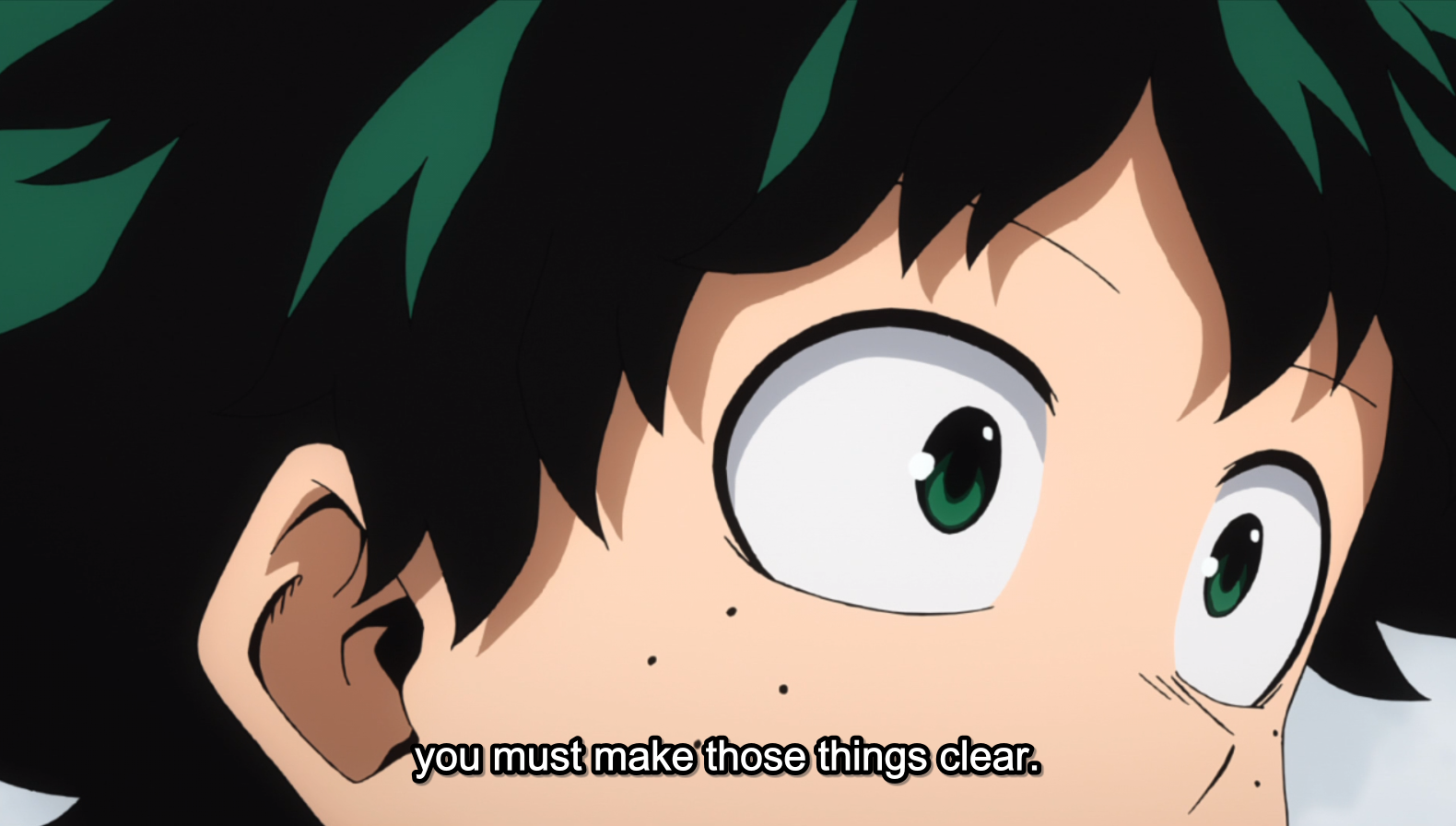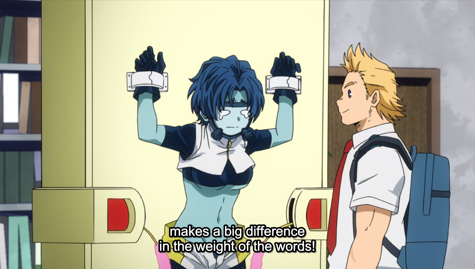 You have this amazing habit of zeroing in on the heart of the matter. I was thinking about that as I watched Nighteye once again disrespect a character (seriously, I’m really angry with him for how he treated Bubble Girl). It’s the classic “might makes right,” but far from being a cliche, the writers are dramatizing its effects through this whole world. It’s the theme that made Stain such a viscerally powerful villain. I couldn’t bring myself to say he was wrong. His reaction to the problem of heroes not being heroic was extreme, but he was right.