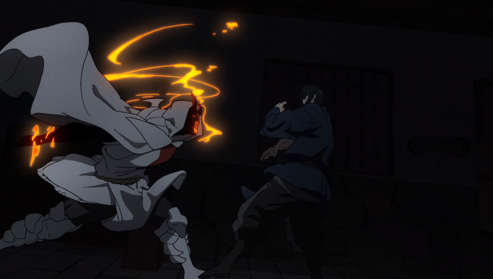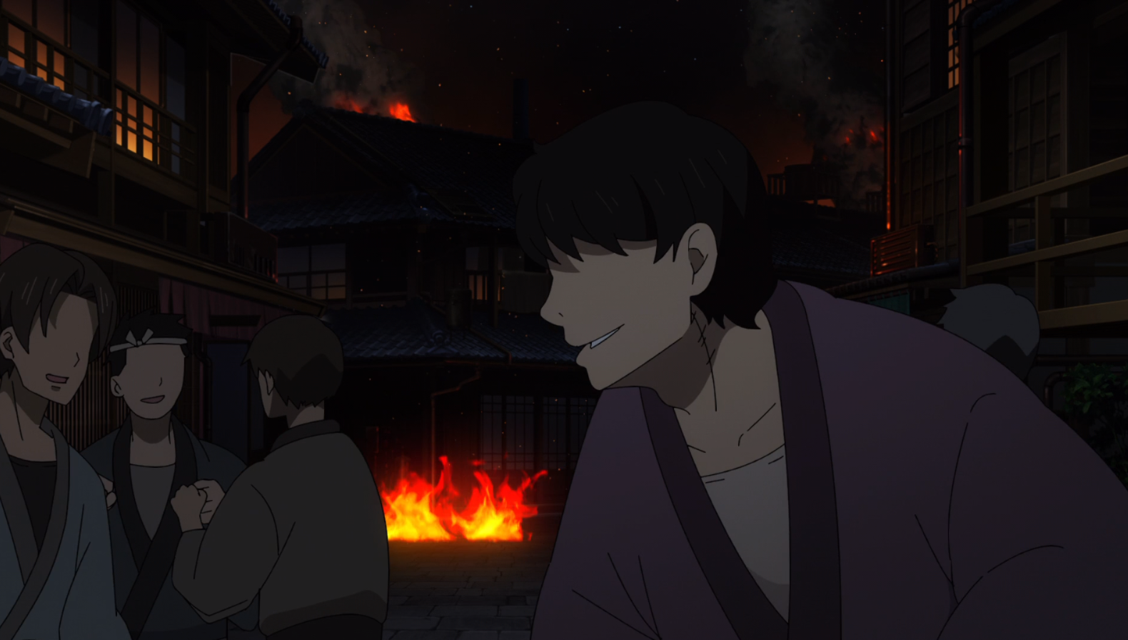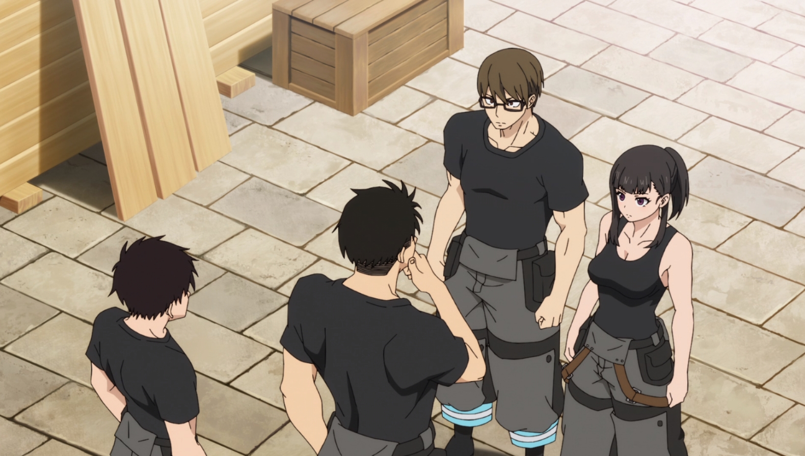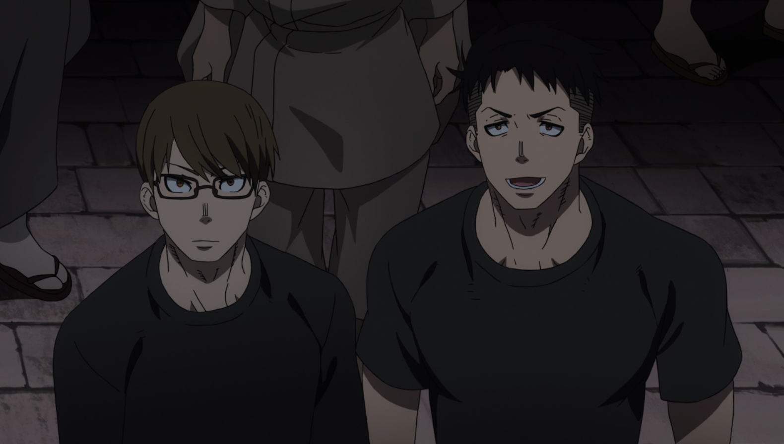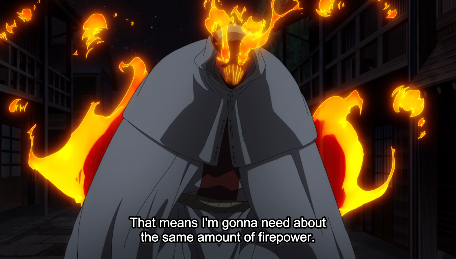 The beginning of the episode takes place at dark night (which means fighting is afoot because all action in Fire Force takes place in darkened environments), and…everybody’s fighting.