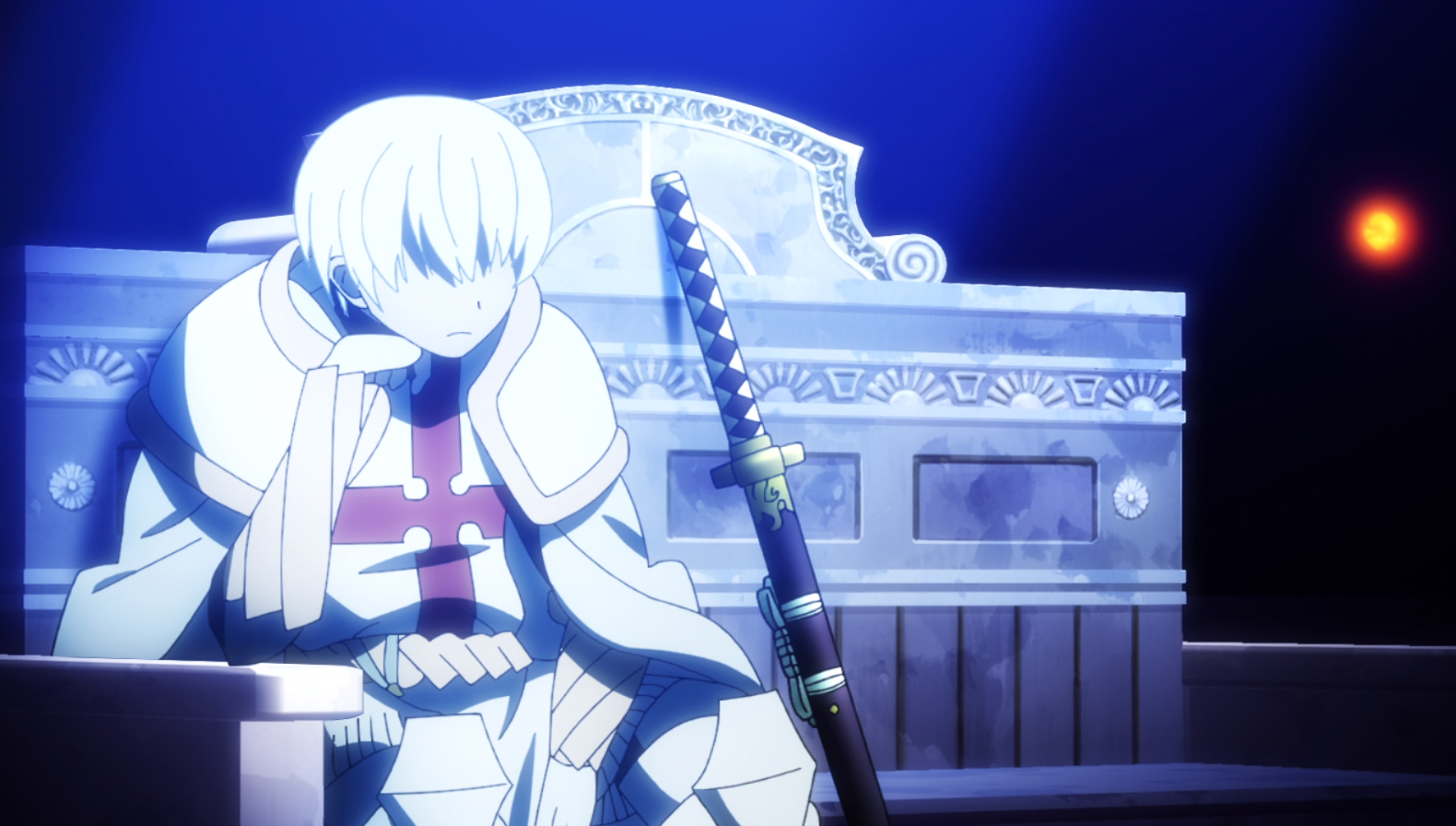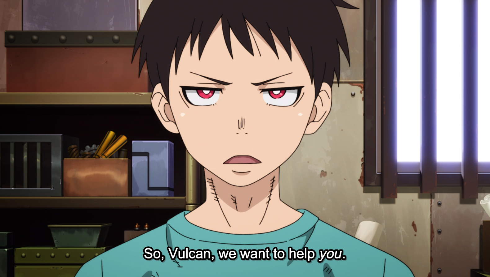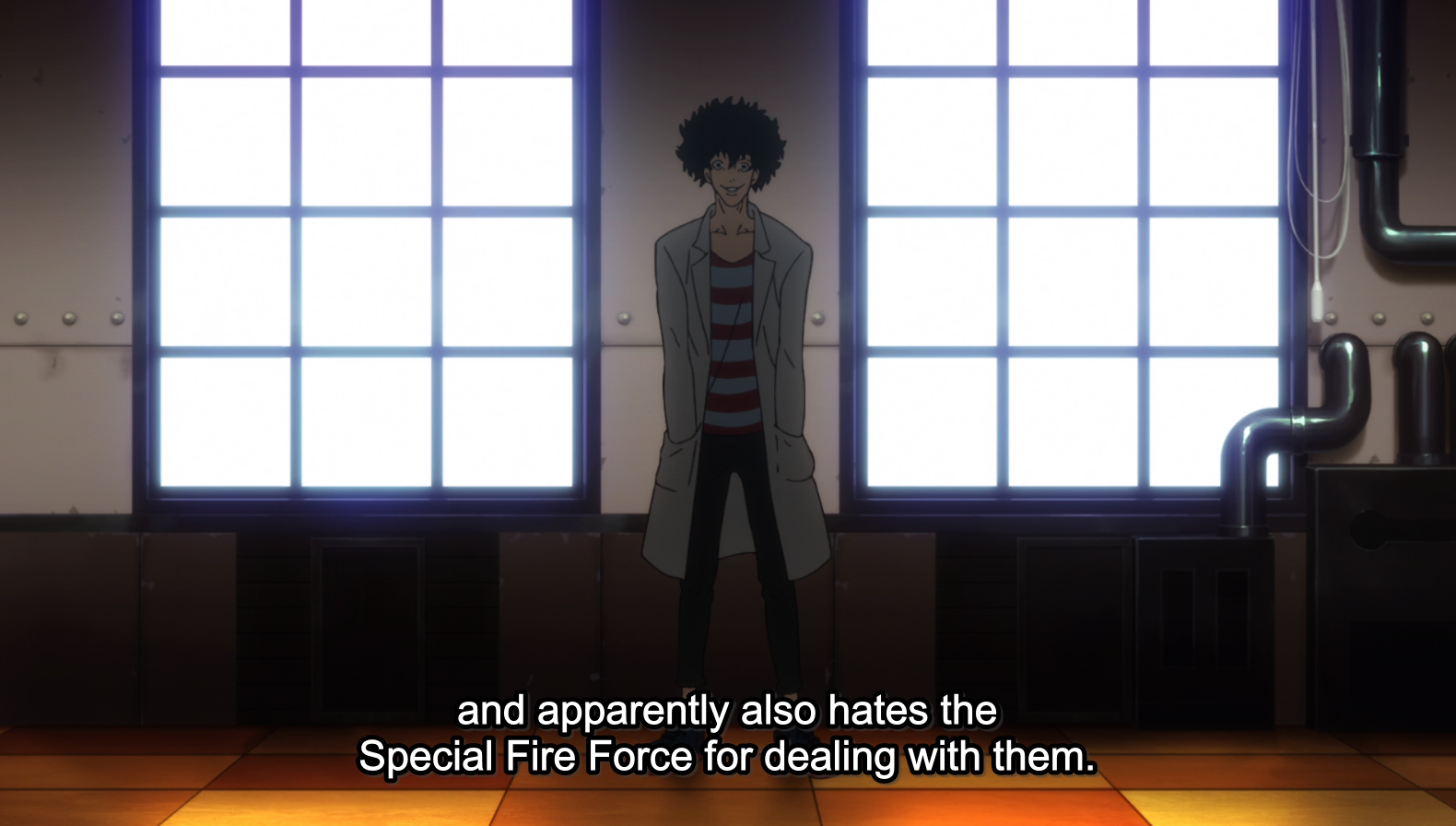 When Viktor is introducing himself he looks harmless enough but boy did they code him as sinister when he steps back and listens to the others. the two last right hand pictures really make it obvious. Fire Force often frames characters in windows, many shows do, it a nice composition with the outside light creating a harsh contrast and the window frame acting as an actual visual border. But Viktor is framed between to windows, completely in the shadows, in the middle of a room in broad daylight when he is not meant to be hiding or discreet. Yet he sort of melts into the background, sneaky and sinister.