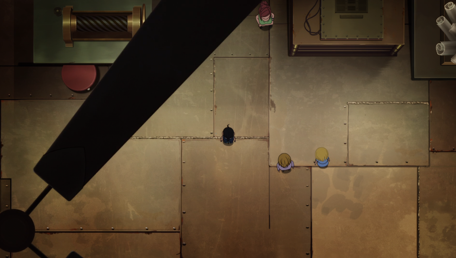 That last shot is just wonderful framing, through the slot in the door. I’m really happy I managed to snag a screencap of it. The angles of the junk wall give such nice depth, you also have the contrasting greens in the distance to create a 3d horizon point and all of it framed to mimic an ultra long screen as if we were watching this on a luxury imax or something. And since this is one of the softest coloured scenes in one of the most colourful episodes, Giovanni’s unusual black silhouette really pops!