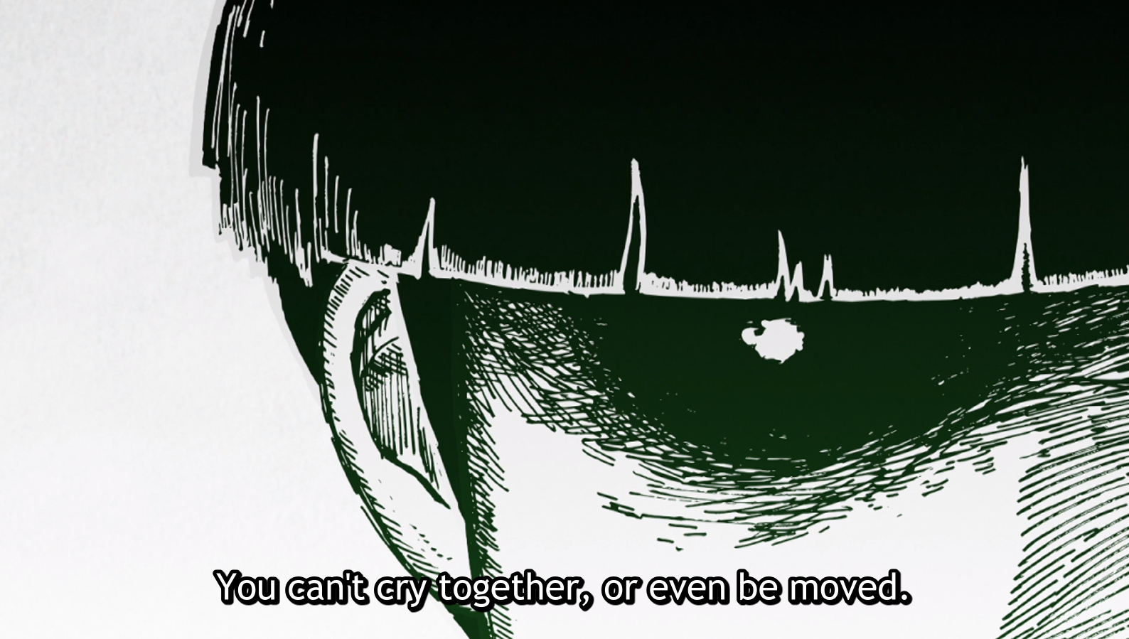 Of course comparing Mob Psycho 100 to Neon (grrrr) Genesis Evangelion is rather pointless. Save from the themes and character archetypes, they are drastically different in tone, genre and even message. It’s apples and oranges. In fact when I mentioned Pixar earlier, it wasn’t random. There’s a lot about Mob Psycho that makes you think it’s a kid’s show. A smart one that can easily be enjoyed by adults but still remains accessible to younger audiences. Consequences never get too bloody, villains are fairly uncomplicated evil so far. You always know exactly who to cheer for. Despite all its wit, it stays straightforward in its morality.