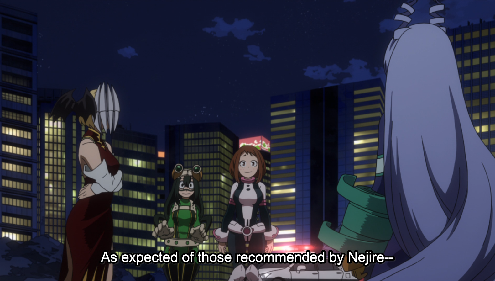 It was fantastic to see the ladies front and center like that. And kicking behind at it! The scene was a short opening tag but it gave me all I needed. The action was fluid and fun to watch. The girls were efficient, powerful and worked very well together. And their mentor, Ryuko, who was on screen for less than a minute, somehow manage to come off as one of the best hero mentors in the series. She gave encouragement and tangible practical advice that was easy to follow and understand. Plus she let the students do the actual work but made sure everything was under control. I am impressed by this agency! One of the best pro heroes, possibly aside from Eraserhead, I’ve seen so far!