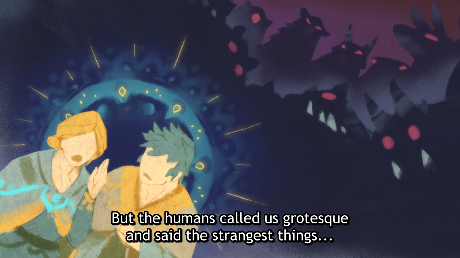 And I really like the visuals. The colours are pretty, and the transitions are good at conveying the mood, such as the expression change on the cat during the conversation. I think it’s more storyboarding than animation, here, but I’m not sure I remember that right. (I might just emphasise what’s easier to parse for me.)