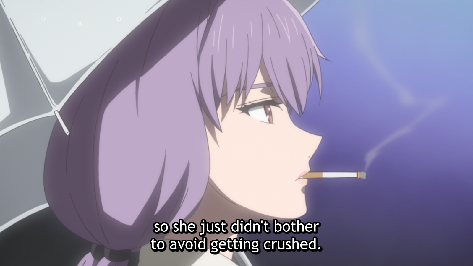 I’m always a little fascinated by watching anime characters smoke. I don’t know why. I guess because it’s a series of small gestures that requires an understated but precise animation. Ot maybe it’s just because I find animated smoke pretty.