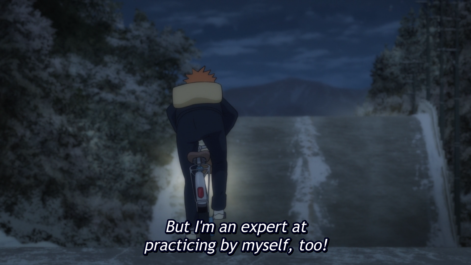 I know I’ve mentioned it before but I think it bears repeating. I love the scenes of Hinata biking home on a lonely road. These scenes have been present in almost every episode this season and I think they create a fantastic visual and symbolic motif. And they’re pretty. They are nighttime scenes with a palette that is different from the rest of the show and have this very deliberate composition with Hinata offside being the only thing that moves on the screen unless a car drives by. They make the world seem huge and infinitely vast. It’s a ritualistic calming down at after a long day of giving it your all and pushing yourself.