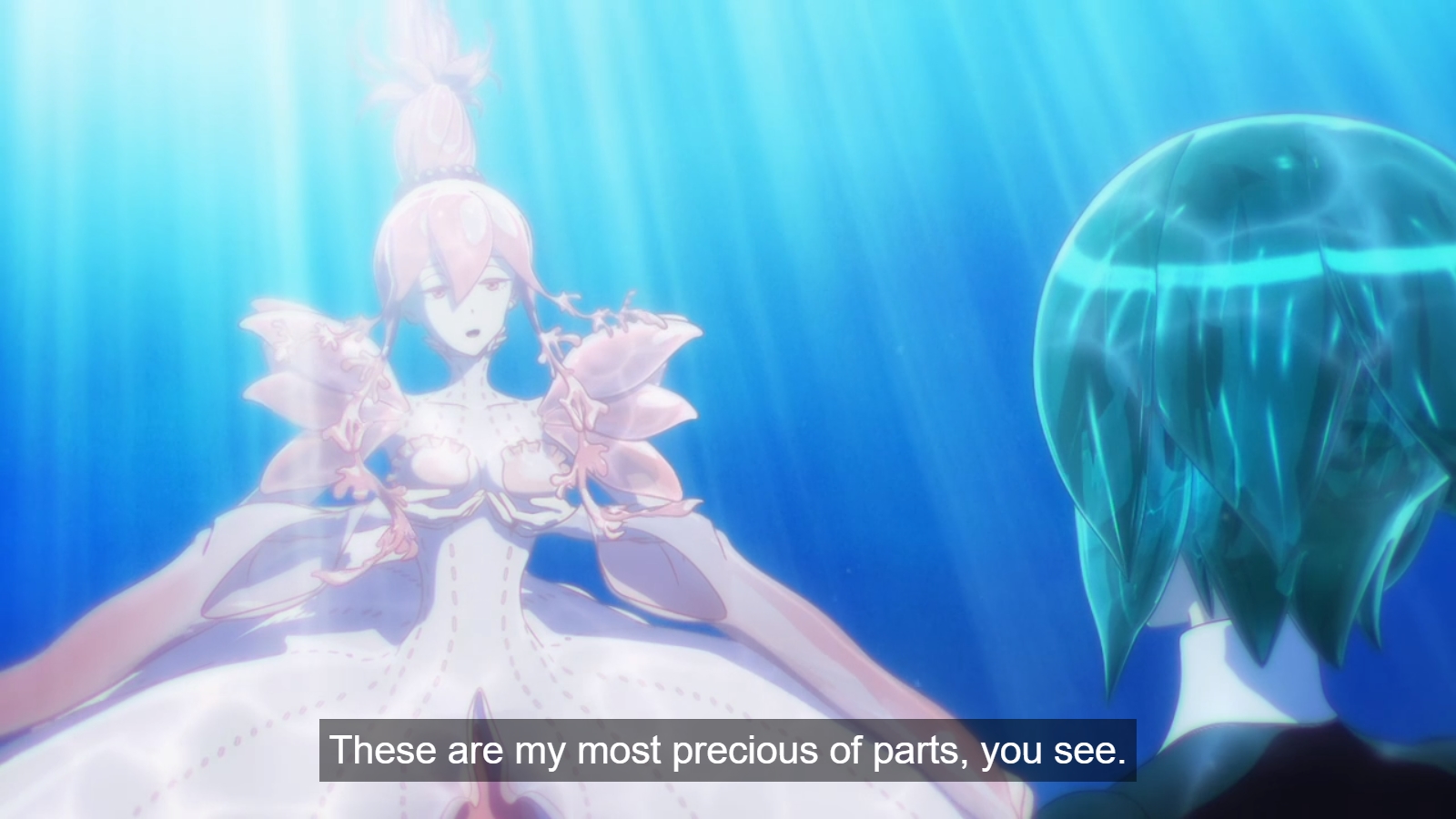 The CG in Land of the Lustrous is good but does fall into the uncanny valley at times and movement is occasionally jagged. The said, you could argue that the odd rigidity of the character models is a choice and a smart one at that since they are in fact made out of mineral and a certain stiffness should be visible. But as it’s not completely consistent, it does break the illusion a bit.