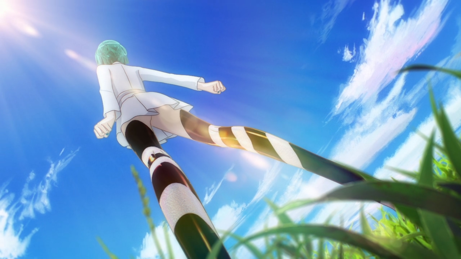 There is this great emptiness to the settings. Wide open fields, huge mostly empty skies, an unending almost barren ocean and a single spartan building. Normally I would clock this as a cost cutting measure but in Land of the Lustrous it was a symbolic visual element that had a visceral effect difficult to explain. That emptiness, those huge open spaces that reflected a sense of timeless and unchanging eternity. It was both pretty and lonely. A little frightening and yet ultimately devoid of purpose. Haunting and sad and yet comfortable and attractive. It’s been a while since I got so much meaning out of the backgrounds of a series. The only ones that compare to me would be the Garden of Sinners movies and they didn’t do it as successfully or Shin Sekai Yori but those were more difficult to appreciate.