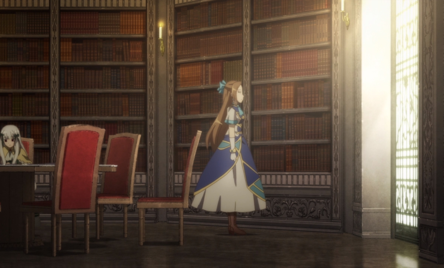…///At this point, the two girls (Mary and Catarina that is) decide to switch over to the library and start heading that way. I just wrote a post on anime libraries so this was very topical for me. On their way the first run into Geordo who decides to invite himself much to the chagrin of Mary. She really is not very good at hiding her emotions and her disappointment at losing her alone time showed on her face perfectly. Geordo teased a bit about it but was generally a very good sport about someone with romantic aspirations trying to spend alone time with his fiance. He’s impressively not jealous which you would think would be a big part of his archetype.