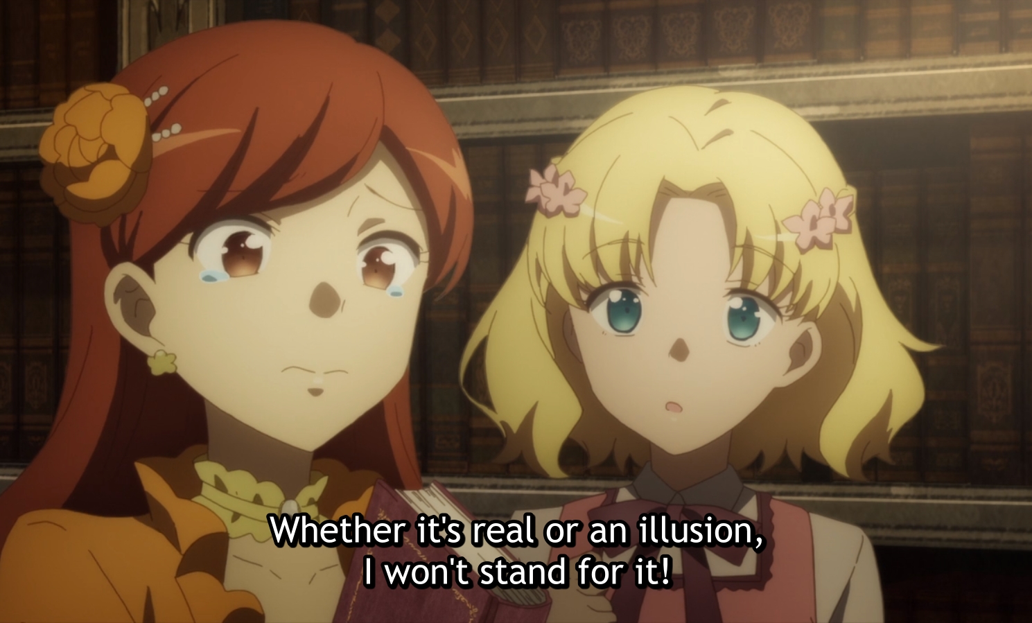 The next scene was Sophia’s, and it was rather sweet. I like little dreams. Sophia and Catarina were in a library again but not the same library. This was Sophia’s private library and Catarina was really impressed by the wealth of romance novels available. She even mentioned wanting to live there which stirred up something in Sophia. The latter reacted by pinning Catarina to the wall with her arms on either side, all aggressive boy in a shoujo type. It was pretty funny to watch, especially as Sophia is markedly shorter. I’m not sure if they were going for actually romantic feelings here or a very strong friendship but either way, it was cute. Cute enough for Mary to slam the book shut again.