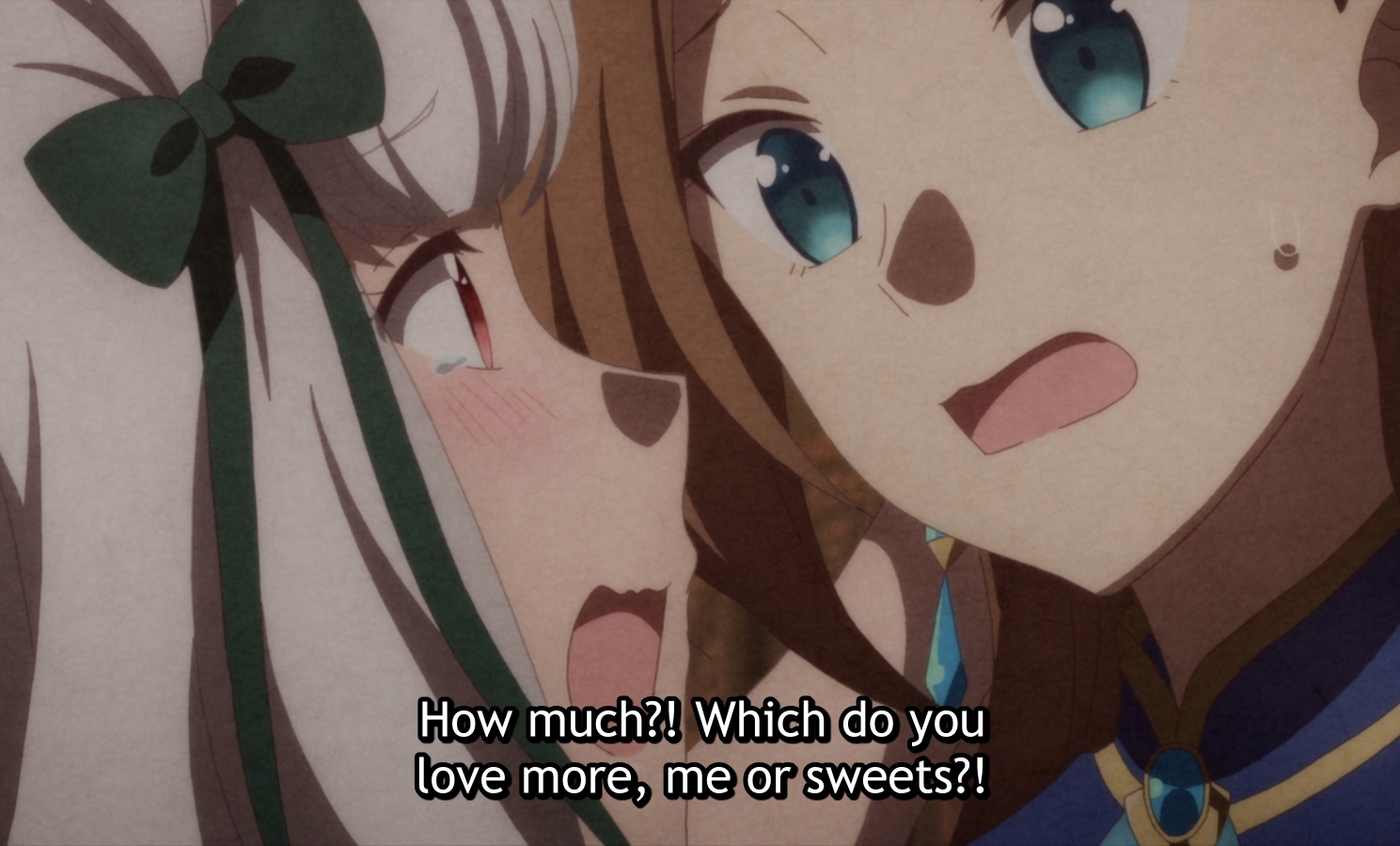 Since Catarina threw the game routes off-track by stealing Prince Alan’s lines, Mary’s devoted wholehearted love turned to Lady Claes instead, with the same determination to become the elegant grand lady to be worthy to stand beside her. But remember the point I made at the beginning of this post that the rule of thumb for adaptation is to “show” not “tell”?The problem with the anime is that we’re TOLD that Mary is supposed to be an elegant lady; but little effort has been to draw her, voice her and shine up her surroundings that viewers get the deep impression that “this is one elegant grand lady of a girl” without having to be told. In fact, the way her jealousy is portrayed tends to detract from that impression–well, look at this episode, if a viewer had never seen the Maries before, which girl would he or she have assumed to be the elegant upper crust girl?