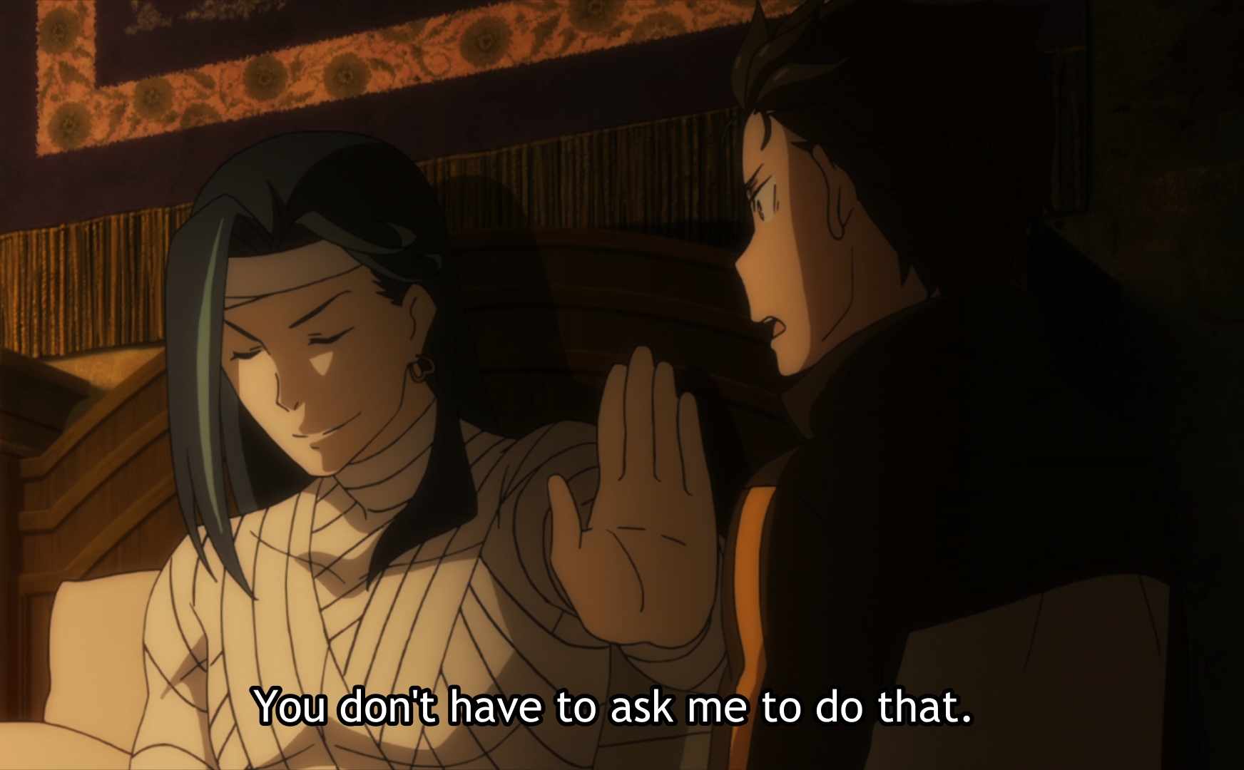 It also seems that Subaru told Ram about the crystal teleporting him, and that’s probably what she meant by Subaru’s relatively noble sacrifice. The stone wasn’t supposed to glow and teleport someone away, and Subaru did well to take it off of Emilia according to her. But Frederica said she had done exactly as Roswaal told her to do when she sent Subaru, Emilia, and Otto off, so I’m not sure what other plan Frederica could even have if the stone was something Roswaal mansion has access to. I wonder if it’s just a misunderstanding, and it was Roswaal who intended for Emilia to have that teleporting stone, and Ram is just unaware of that because he left her in the dark. As for why Roswaal would want Emilia to have that stone which would teleport her away, I have no idea. Maybe this will be made clear in a future episode of this fourth arc, which I feel was only split into 2 different cours because of COVID-19.