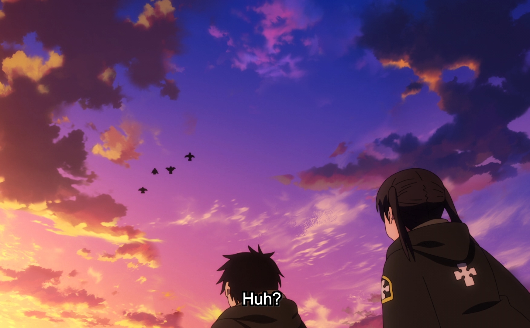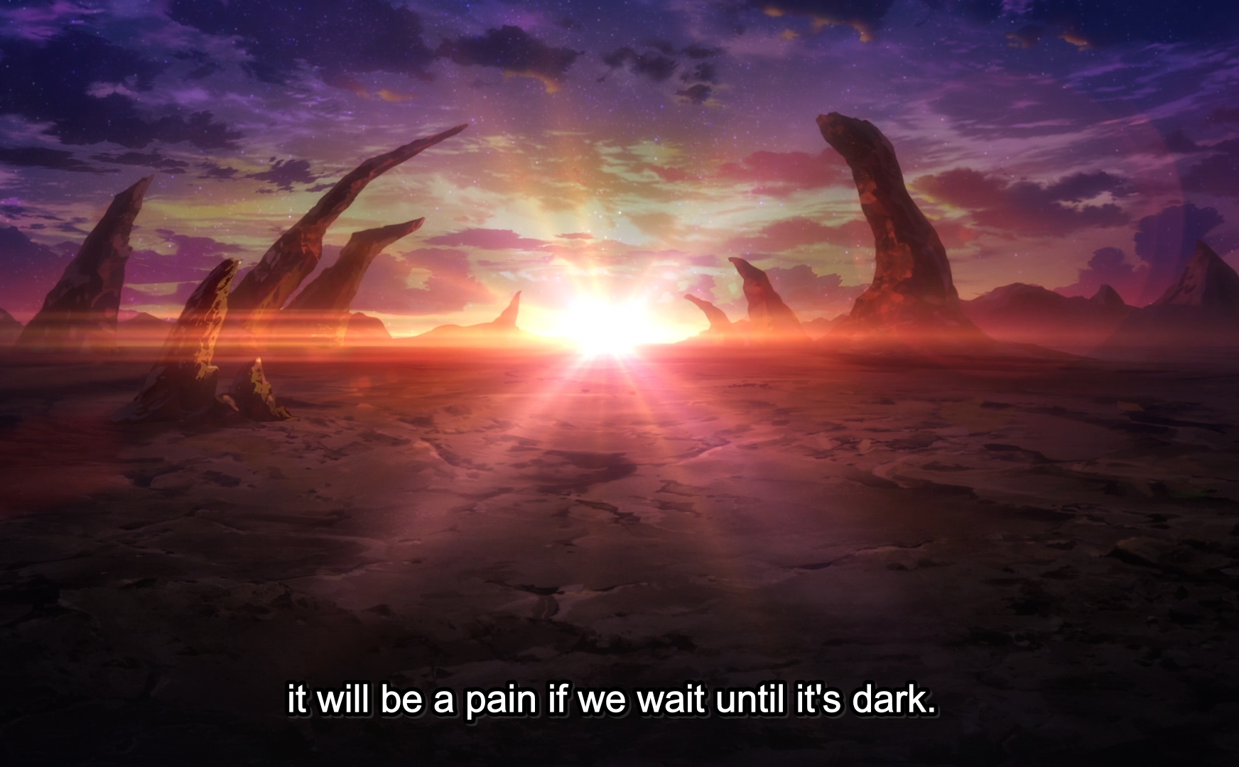 I just end up saying the same thing every episode but man Fire Force is pretty. More accurately it’s my aesthetic, but there are elements that are in my opinion objectively attractive. Like the skies. Fire Force has some of the best skies in anime. and the colours. Palettes are judiciously chosen for narrative effect and great to look at. Right from the opening scenes, I couldn’t get my eyes off those deep blue skies colliding with the contrasting mass of ochres, reds and purples blended into the desert scenery. Little did I realize, those where the boring backgrounds…