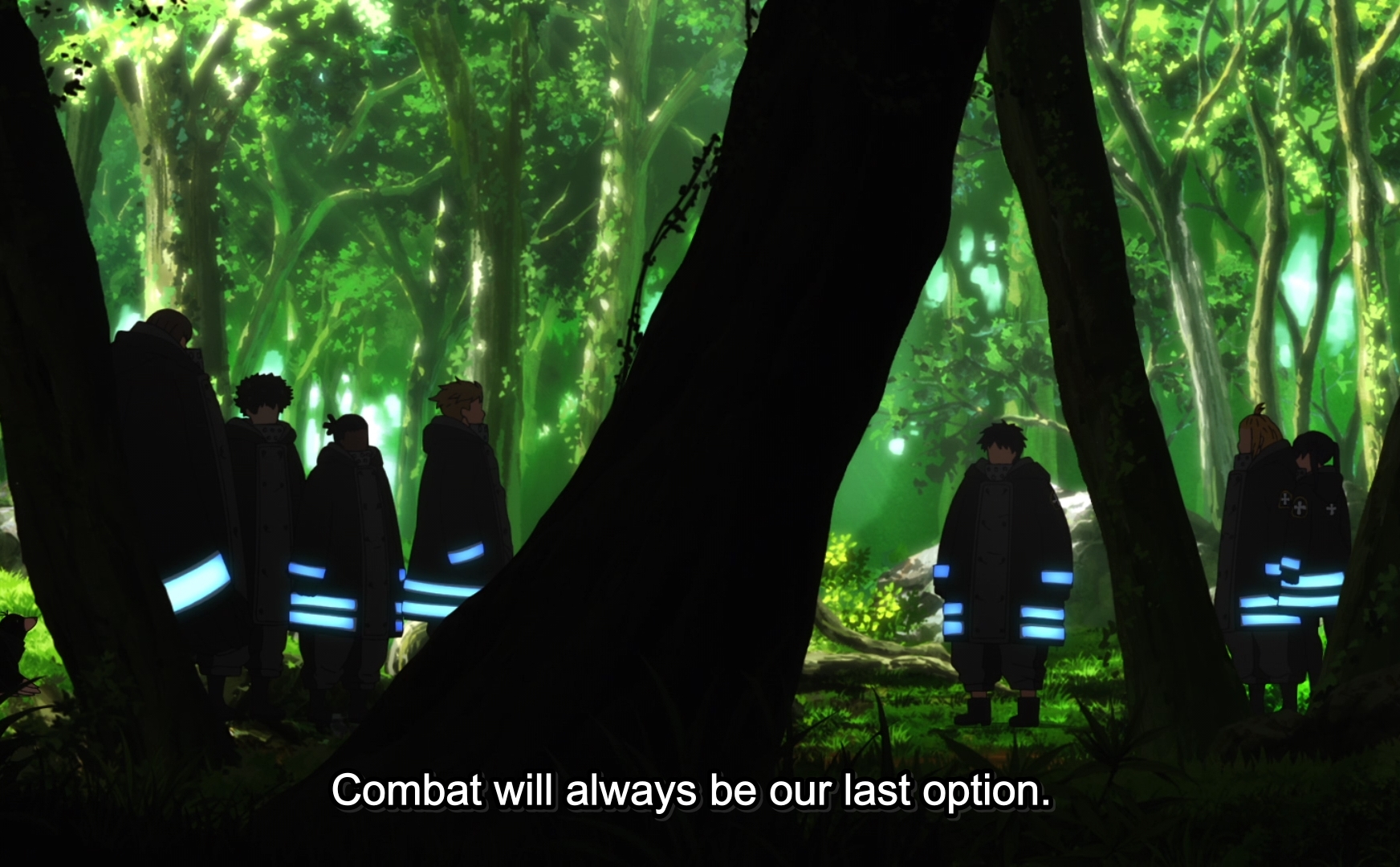 We also find out that this same desert is literally littered with infernals. So much so that they shine like stars at night. Left to their own devices, infernals simply burn forever, unable to do much for themselves. Standing around and waiting for nothing in particular. Suddenly the Fire Force really does sound merciful in its approach. Latom. It was a powerful scene delivered in a casual manner. I sort of felt it right along with Shinra. And of course, it was awesome to look at. I still can’t get over how brilliant a design element those reflective bleu bands on the fire force uniforms are! Just look at this composition: