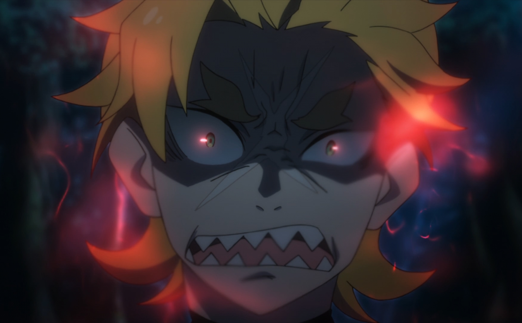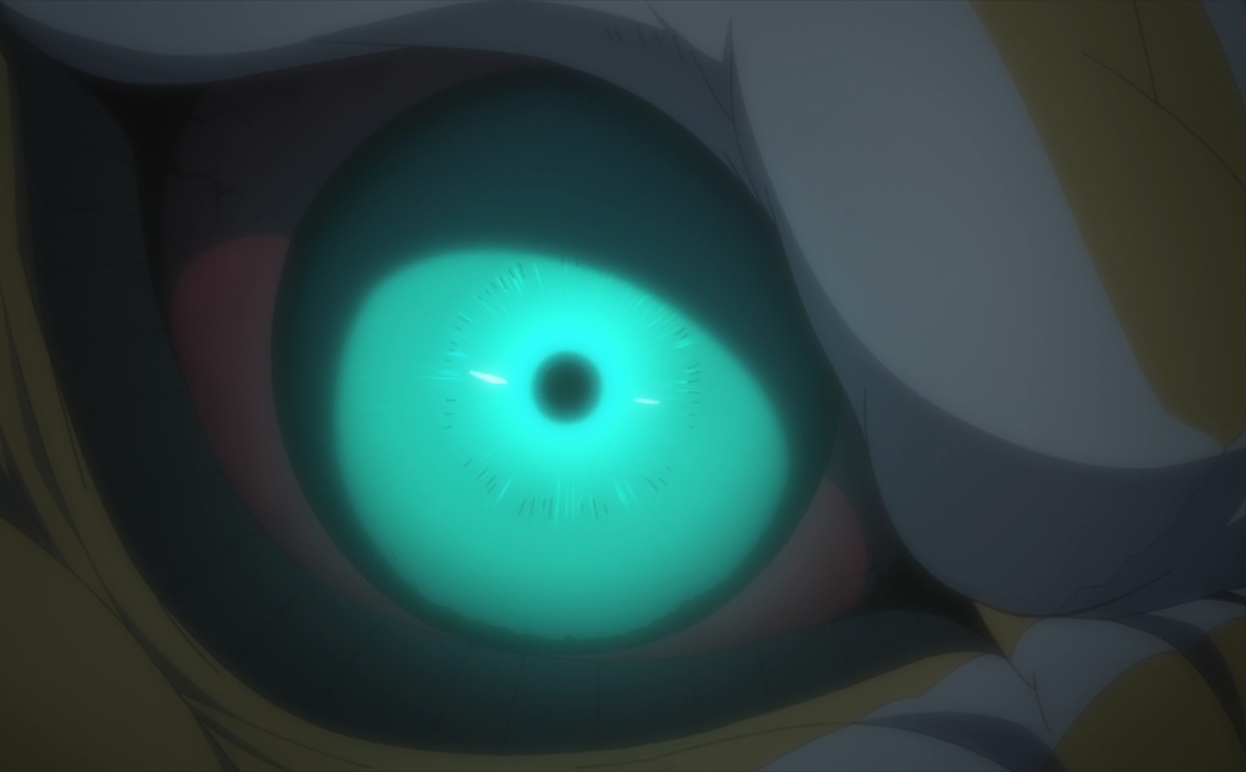 Now I get that Garfiel was glowing from within. That’s why his beast’s eyes are like that. It looks kinda cool. I understand that he was casting that magic red glow around himself. But why are his eyes and forehead in complete shadow when there’s a bright red light right there? IIt is casting light because we see it in his eyeshines… And earlier we had Roswaal with his ow odd eyes: